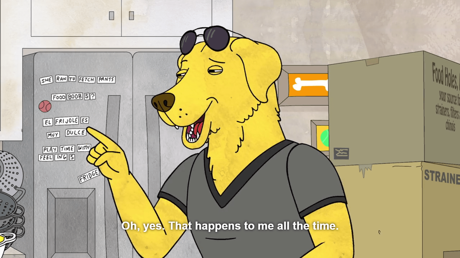 Mr peanutbutter spaghetti strainers. Peanutbutter finishes the movie and sees that he has ninety eight missed messages. Key elements of season 3 had all lead up to its last episode. Peanutbutter is hailed as a hero for stopping the pasta apocalypse. Peanutbutter then fills his home with boxes of strainers oxnard s sarcasm going over his head taking the idea seriously.